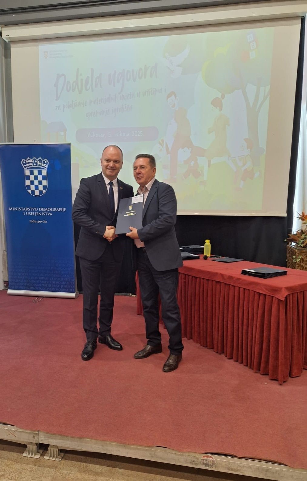 Načelnik Općine Oriovac Antun Pavetić danas je u Vukovaru prisustvovao potpisivanju dvaju ugovora s Ministarstvom demografije i useljeništva, čime su osigurana sredstva za važne projekte namijenjene djeci i obiteljima na području općine.