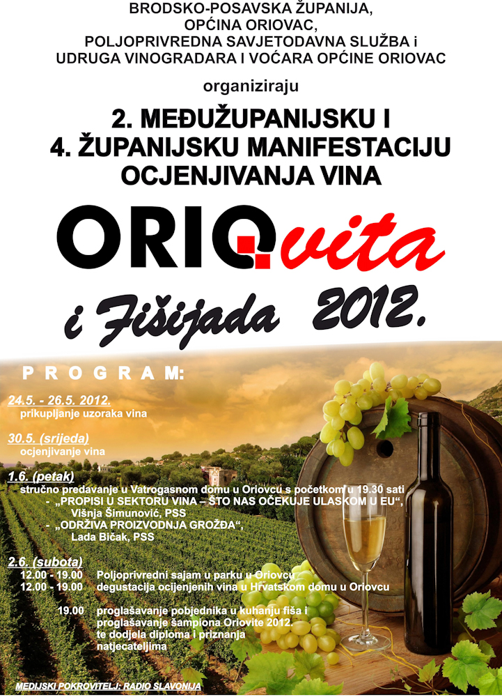 Općina Oriovac, Brodsko-posavska županija, Poljoprivredna savjetodavna služba i Udruga vinogradara i voćara Općine Oriovac organiziraju 2. Međužupanijsku i 4. Županijsku manifestaciju ocjenjivanja vina ORIOVITA 2012. Manifestacija će se održati u Oriovcu od 28. svibnja do 02. lipnja.